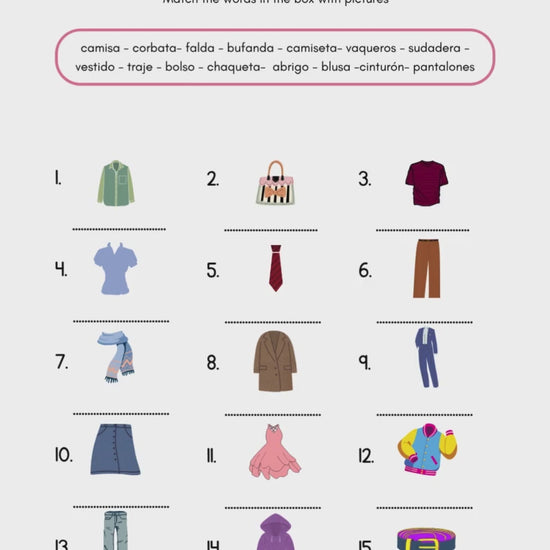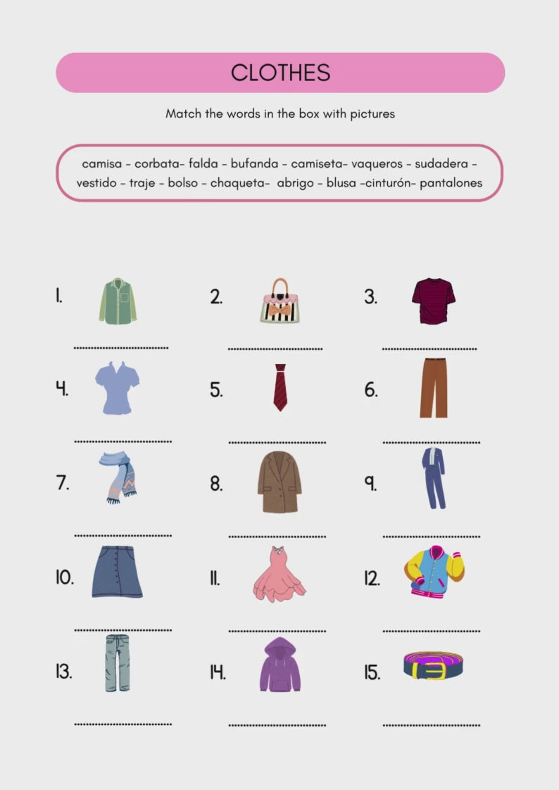 Help your students master Spanish clothing and accessories vocabulary with these interactive and visually appealing worksheets! Designed for learners of all ages and beginners, this resource makes learning new words fun, memorable, and practical — perfect for everyday conversations and classroom activities.