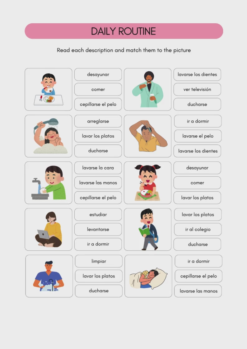 Download your Spanish Daily Routine Worksheets today and help your learners speak, write, and understand Spanish naturally — every single day!