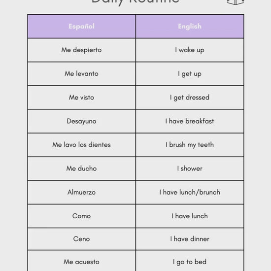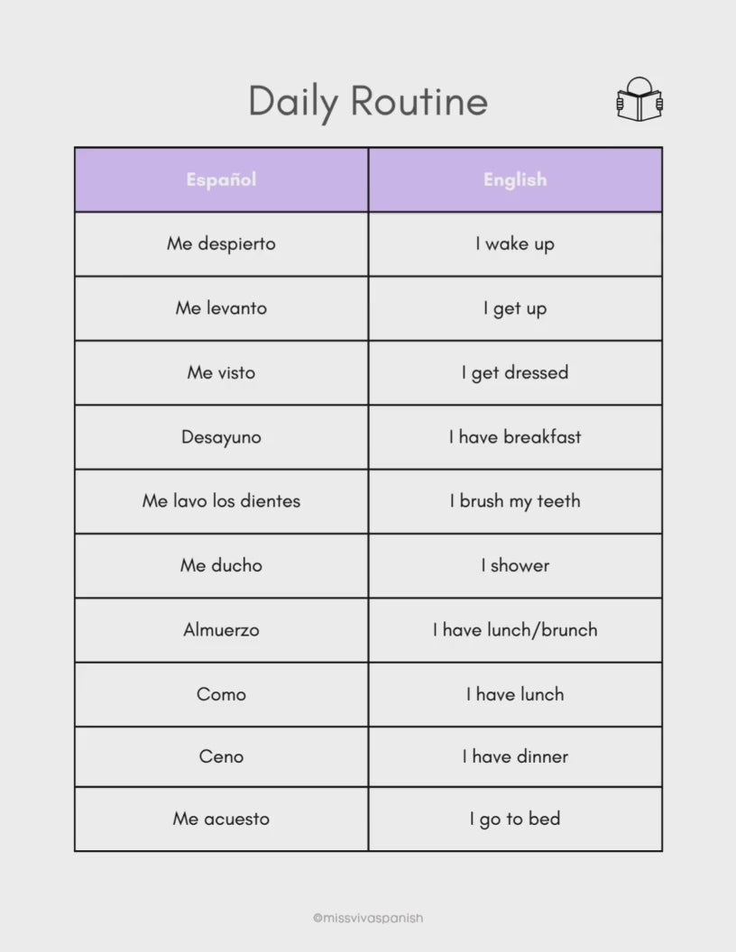 ✅ Comprehensive vocabulary lists of common daily routine verbs (levantarse, ducharse, desayunar, ir al trabajo).