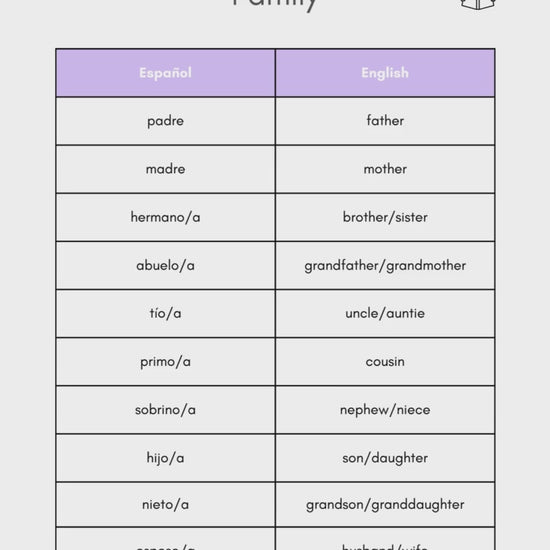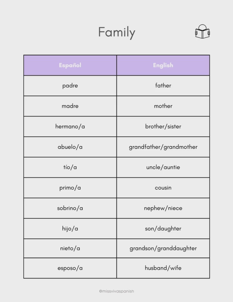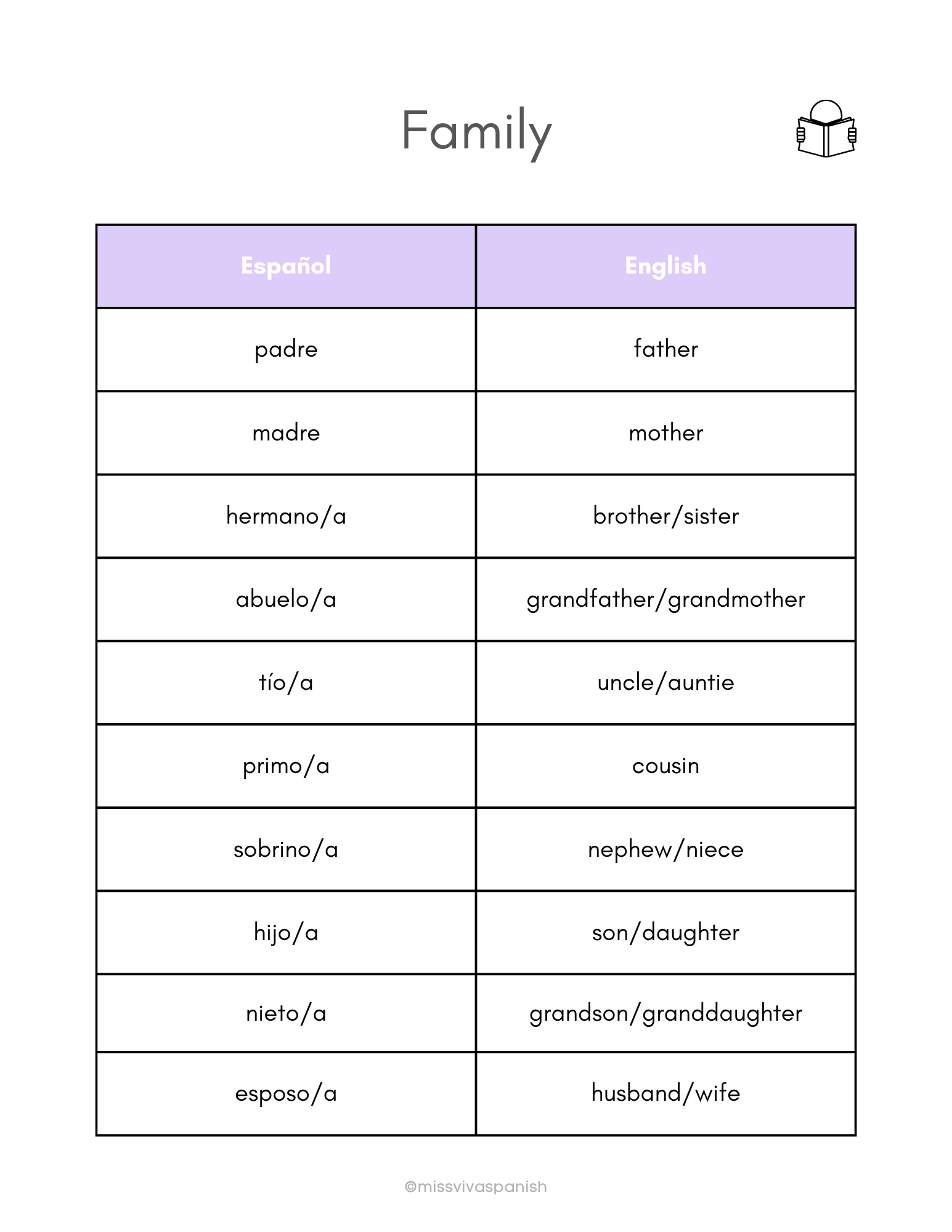 - Illustrated vocabulary for common family members (mamá, papá, abuela, tío, primo, etc.)