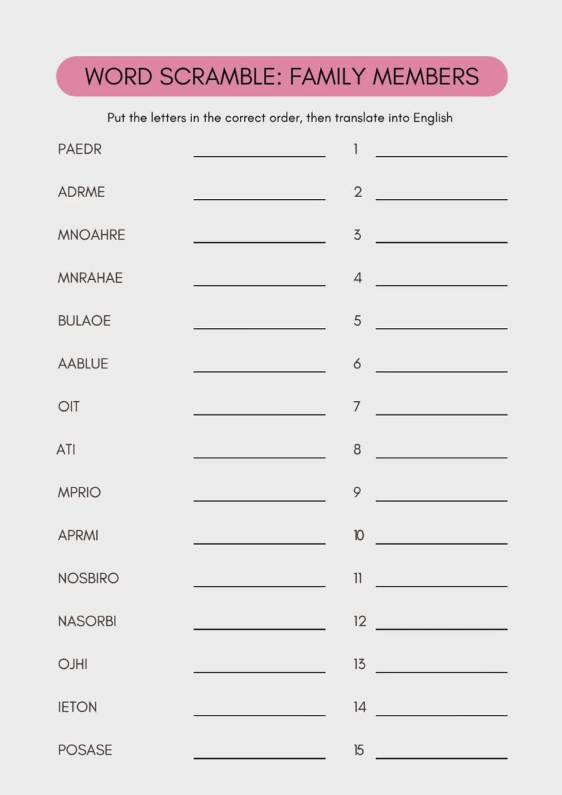 - Engaging exercises that support both individual and group learning (word search, word scramble, family tree, flashcards, etc)
