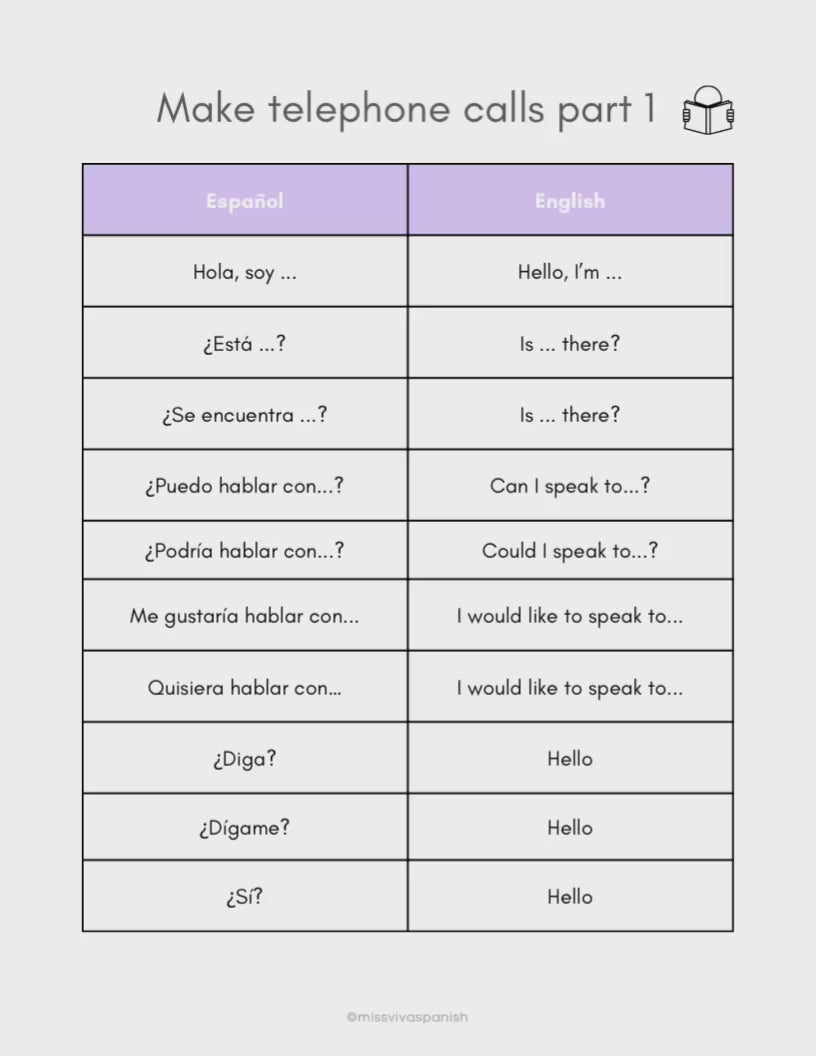 ✅ Common Spanish phone expressions for answering, calling, leaving messages, and requesting information.