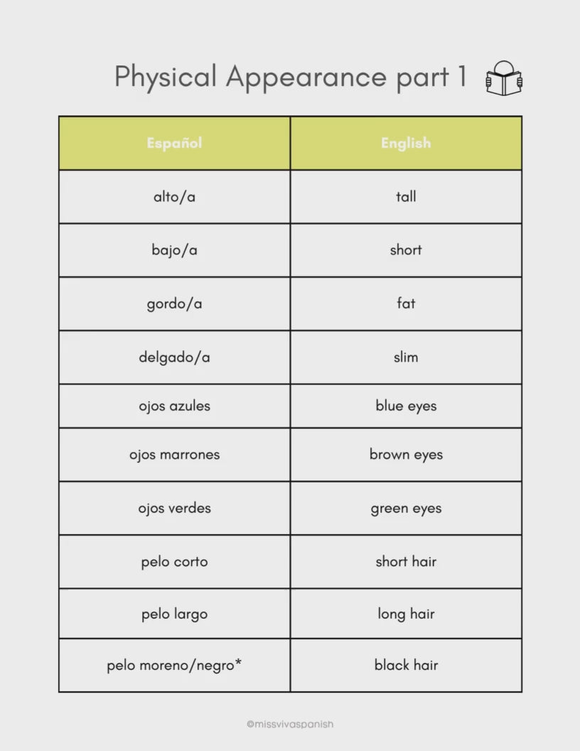 ✅ Comprehensive vocabulary lists for describing physical traits — hair color, body type, facial features