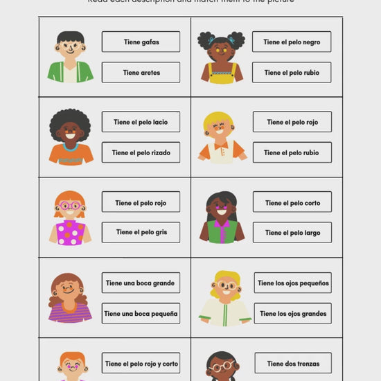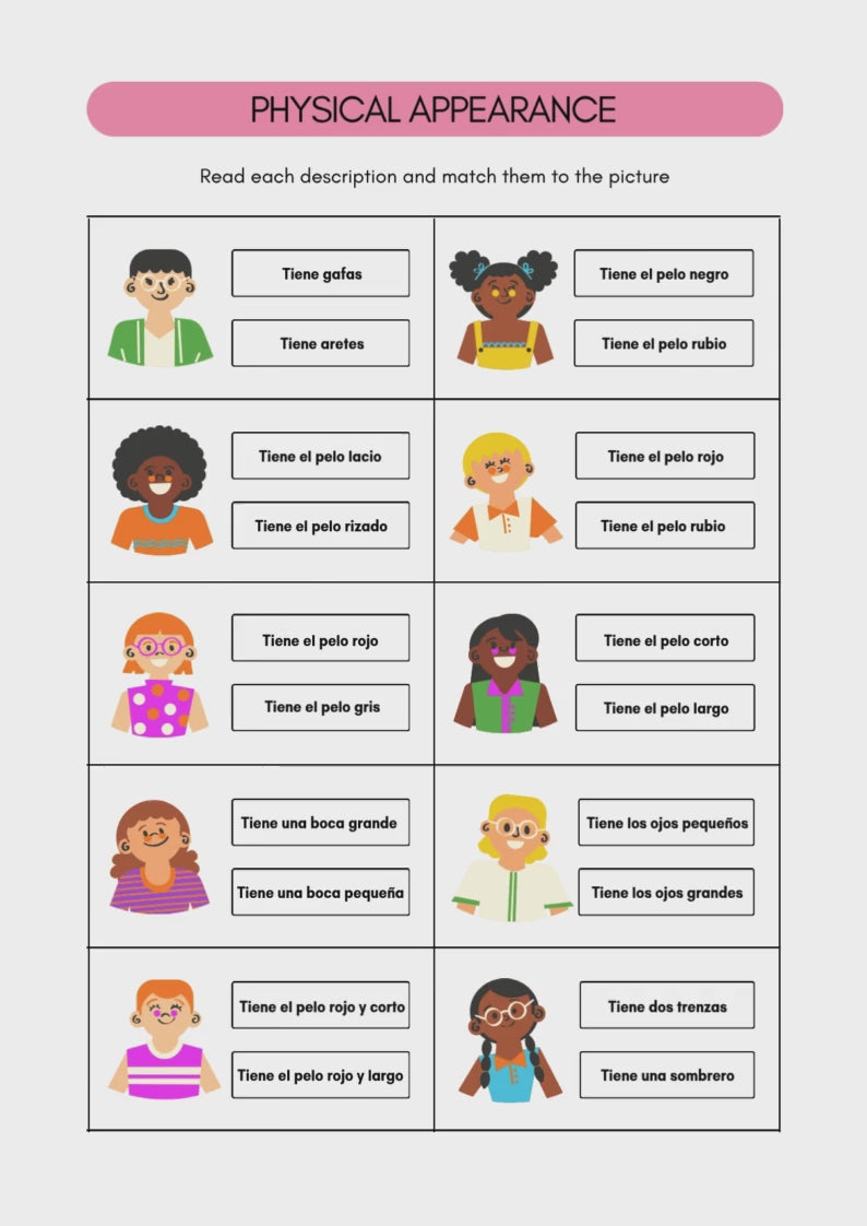 Bring your Spanish lessons to life with our Spanish Physical Appearance Worksheets — the perfect resource for learning how to describe people’s looks and characteristics in Spanish with confidence and accuracy. Designed by expert educators, these Spanish descriptive vocabulary worksheets help learners use real, everyday language to talk about height, hair, eyes, and more.