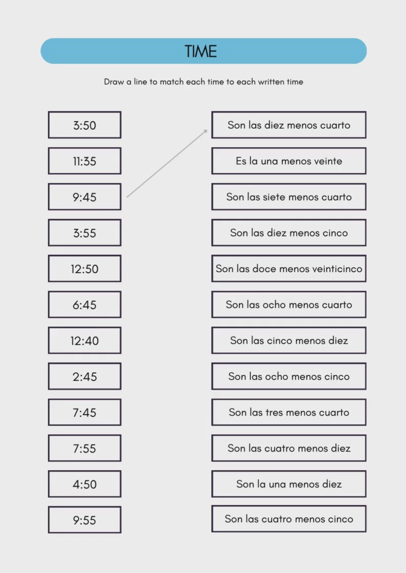 - Vocabulary practice for telling time in Spanish (la una, las dos, y cuarto, media, menos, etc.)